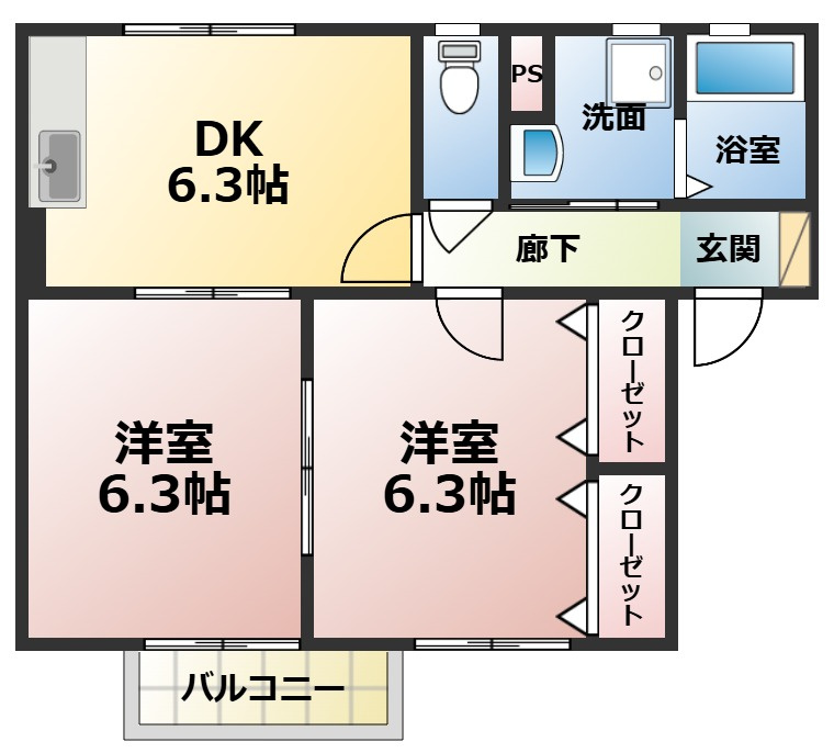DK 7.0帖/洋室 6.3帖/洋室 7.3帖 - 向き